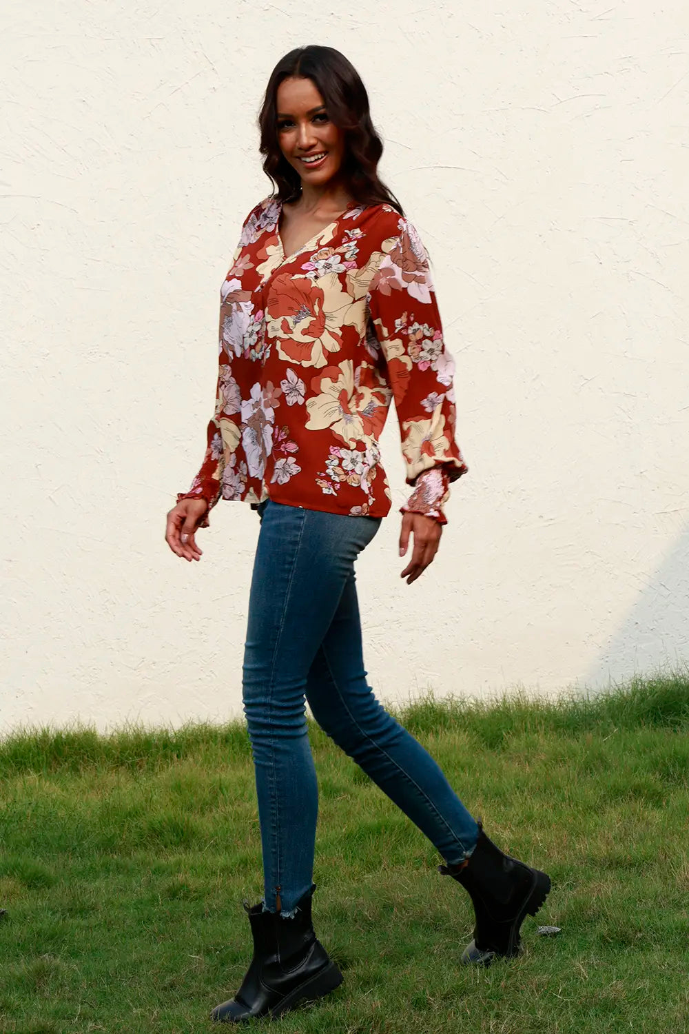 Floral V-Neck Smocked Lantern Sleeve Blouse