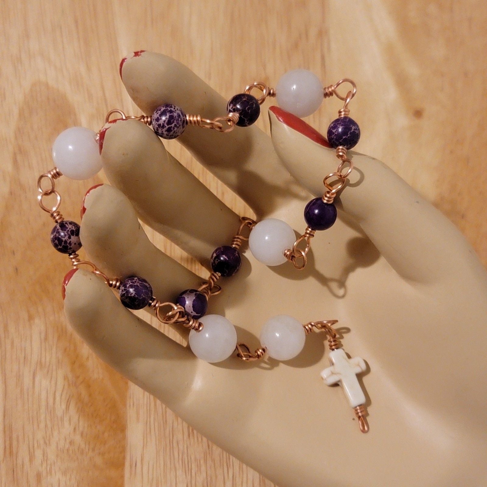 Beautiful handmade rosary-style bracelet created with a mix of natural gemstones and warm copper wirework. This piece features smooth white quartz beads, purple jasper beads with striking patterns, and a white howlite cross charm as the focal point. Each bead is individually wrapped with copper for strength, durability, and an artisanal finish. The bracelet has a classic rosary layout, making it perfect for daily wear, prayer, meditation, or as a meaningful gift.