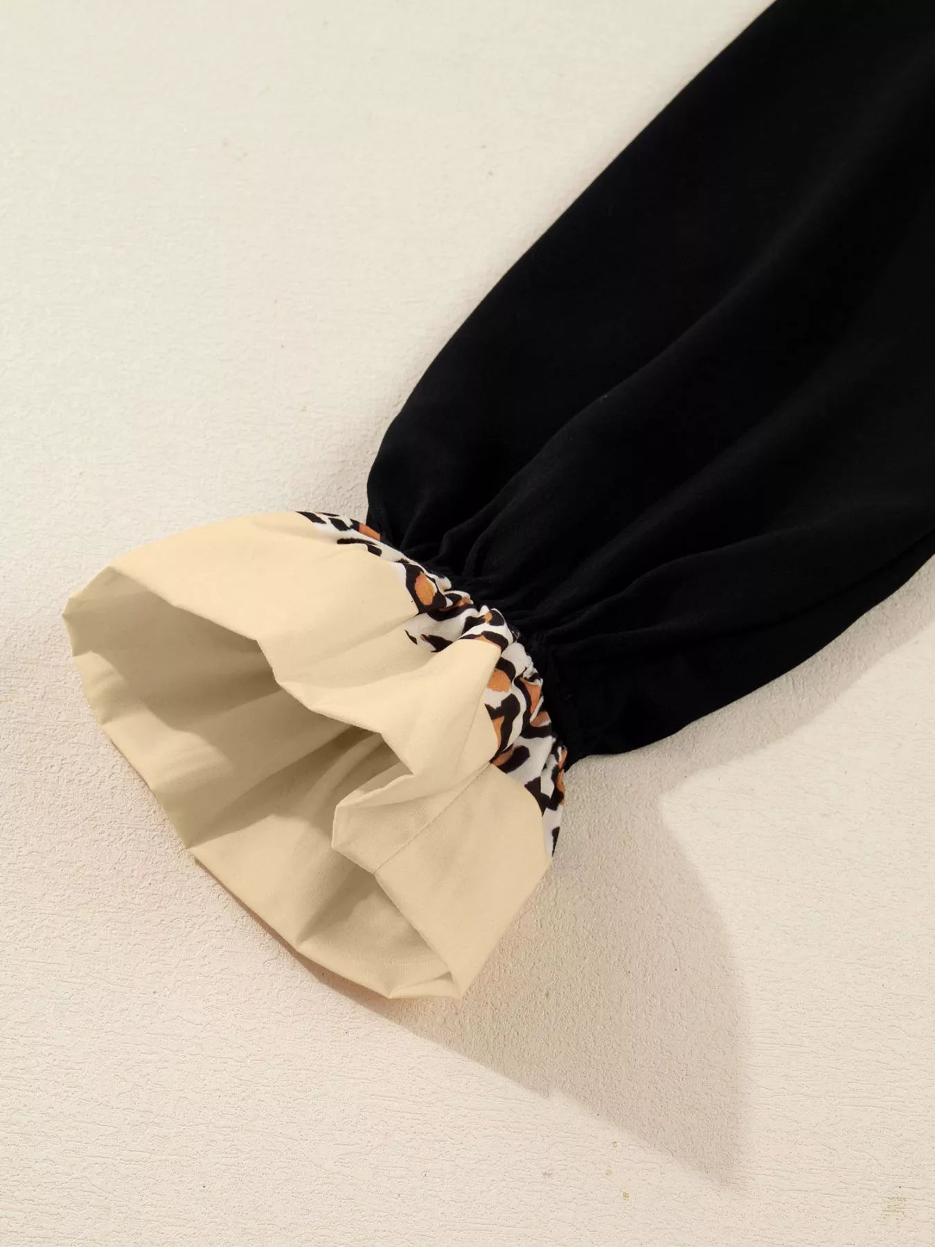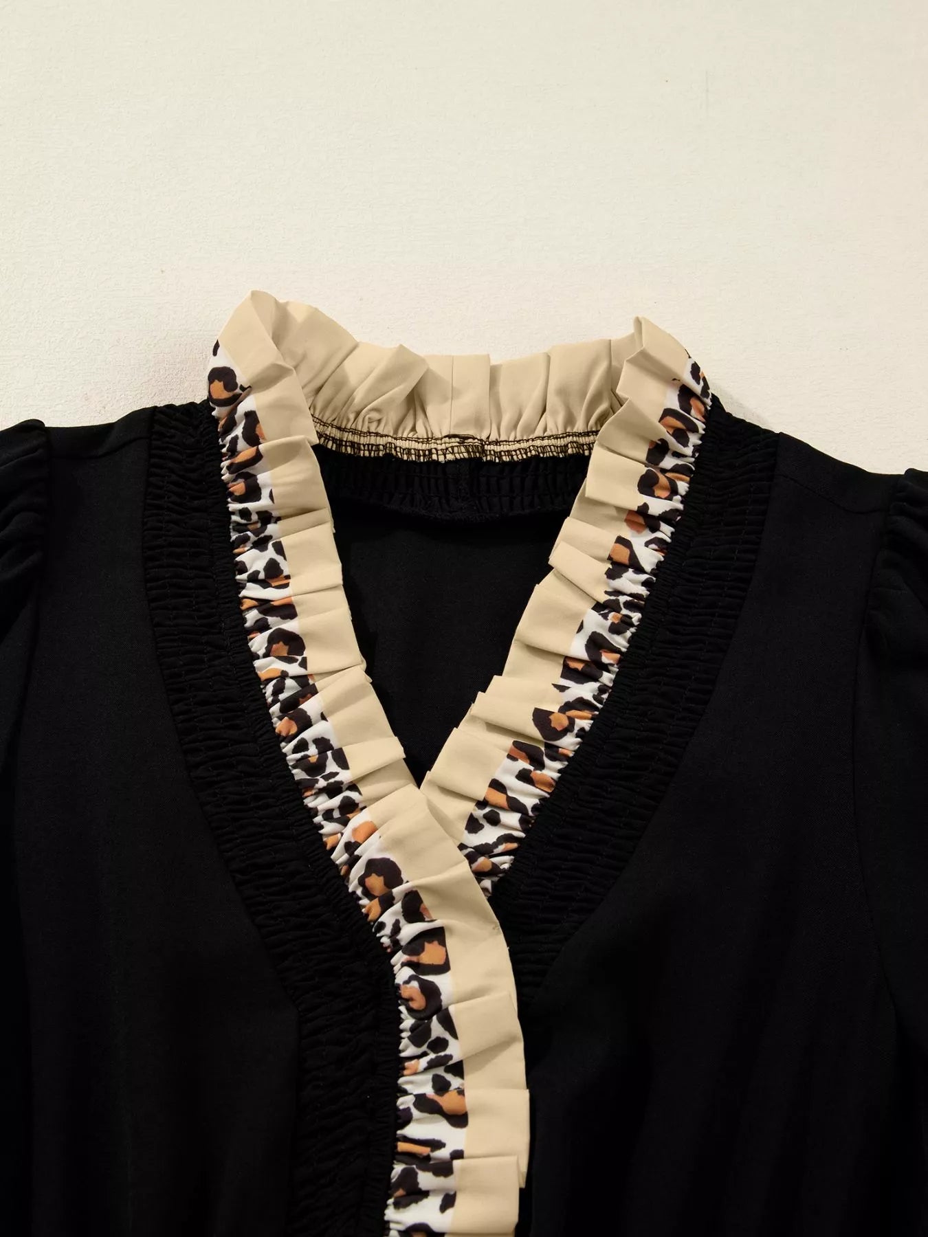 Contrast Leopard Frilled Trim V Neck Bracelet Sleeve Midi Dress