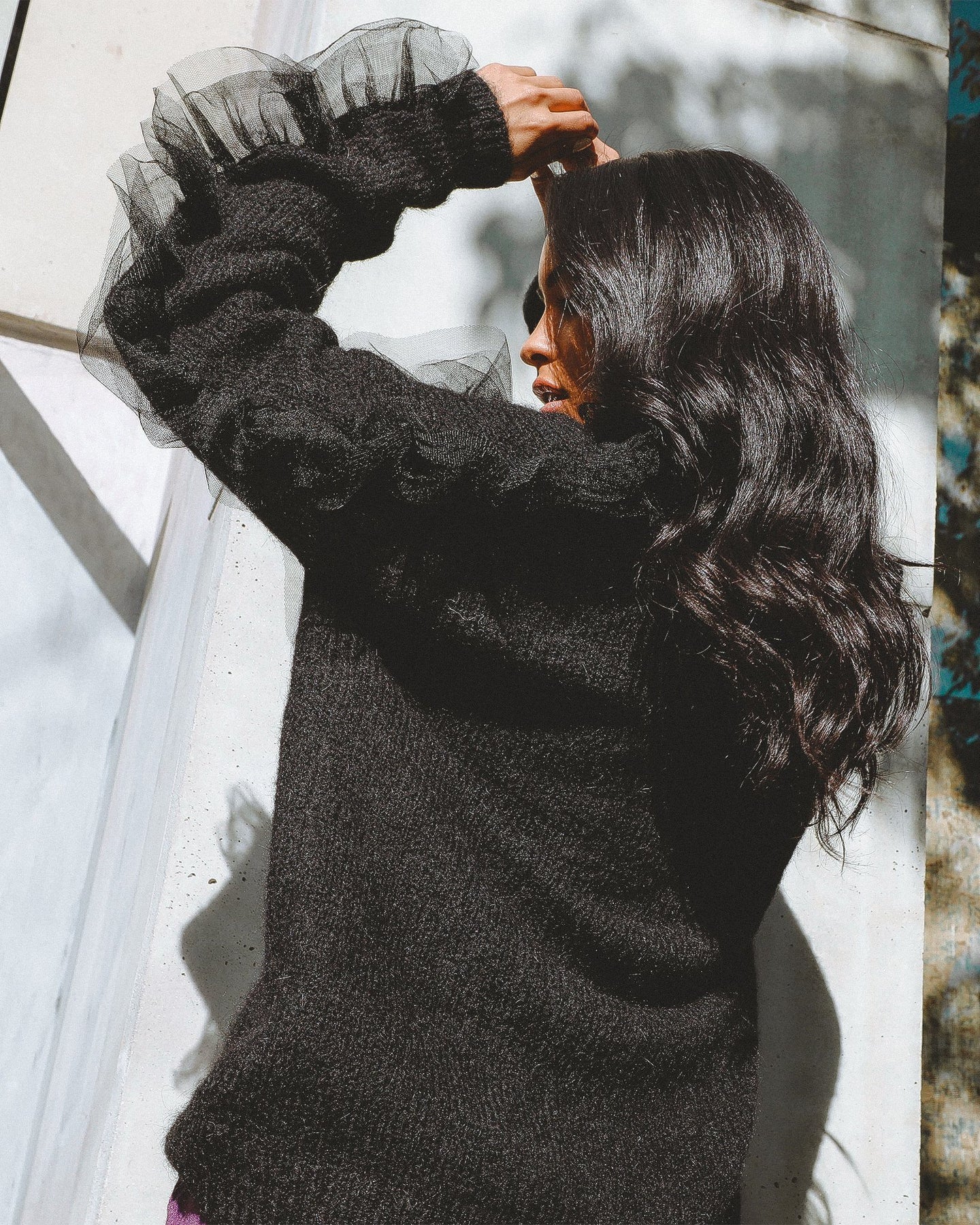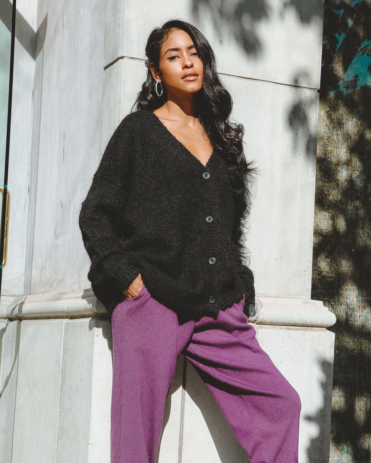 Glam meets cozy in this super-soft relaxed button-down cardigan. Knitted from a comfy wool blend, it has a v-neckline with ribbed trimming and features ruffled organza statement sleeves for a decidedly feminine feel. Designed with a relaxed fit, this cardi is perfect for pairing with your favorite leggings for coffee meetings with your BFF, or workin’ it with leather leggings for date night.
