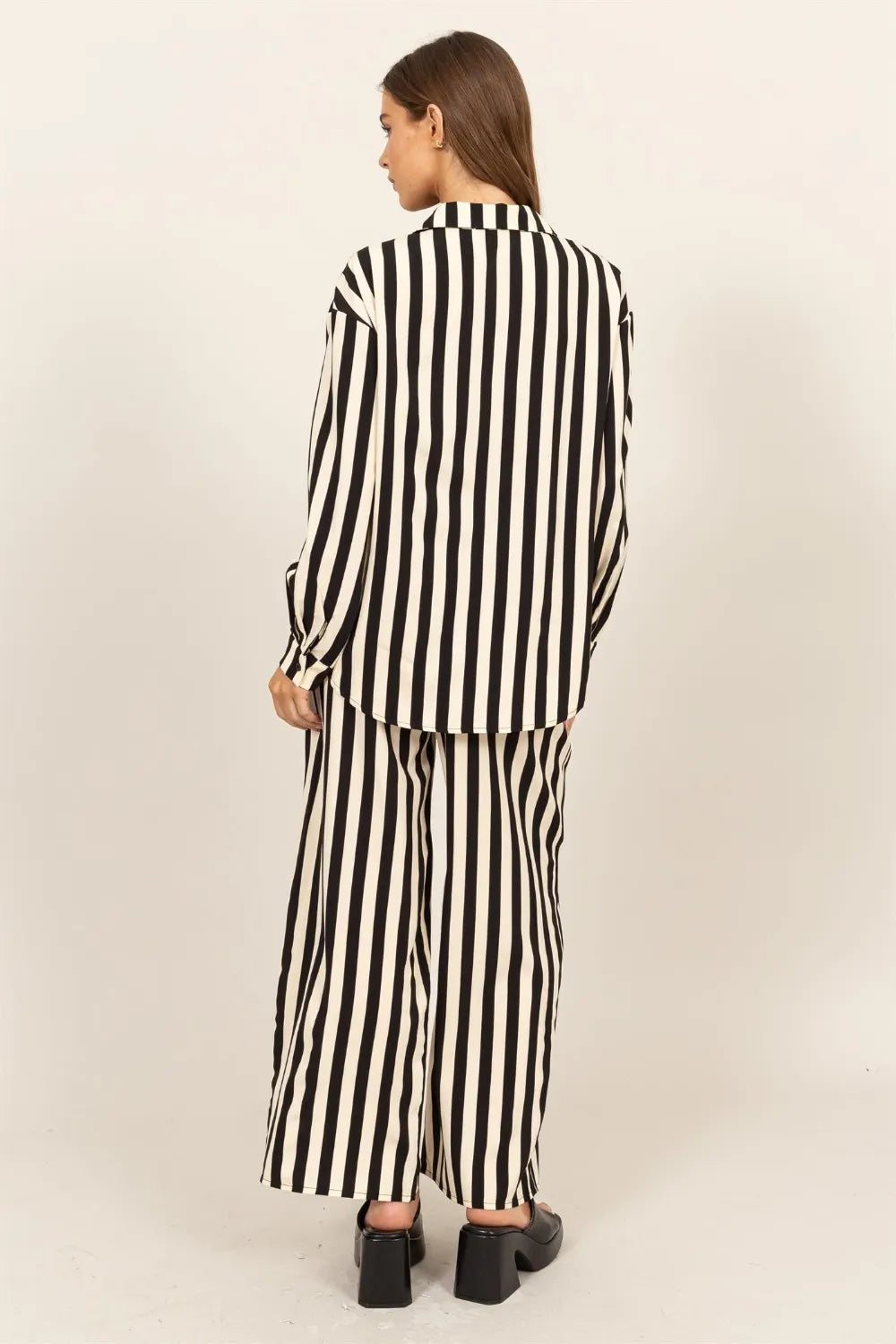 Make a bold fashion statement with this striped button-up set. The set includes a long-sleeve button-up shirt and matching wide-leg pants, both featuring striking vertical stripes that exude modern sophistication. The shirt comes with a classic collared neckline, buttoned cuffs, and front chest pockets, adding both functionality and style. The wide-leg pants offer a relaxed fit with a comfortable waistband, making them perfect for all-day wear. Whether you wear them together for a cohesive look or mix and match them with other pieces, this set is sure to elevate your wardrobe with its chic and elegant design.
